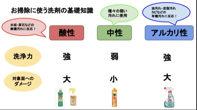 以上の中性・酸性・アルカリ性の洗剤を汚れの種類によって使い分けて汚れ落としをしていきます。
