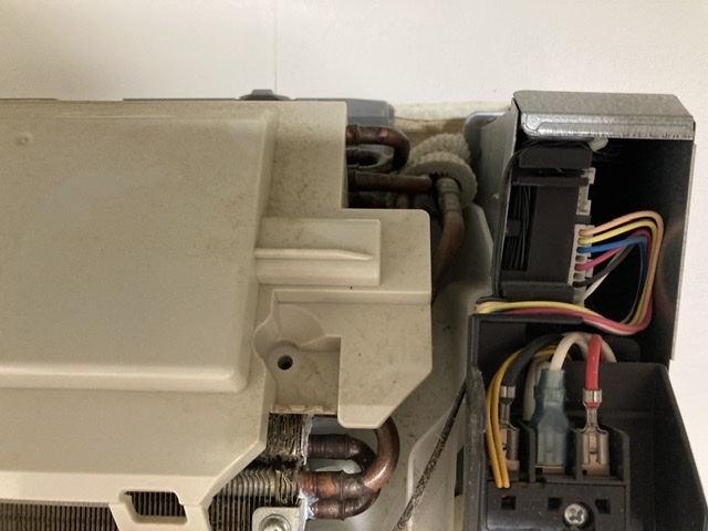 右側の銀色のカバーで覆われているのがエアコンの基盤で、ここから配線を伸ばして電気を走らせているのですが、グレーの物体に配線が伸びていません。