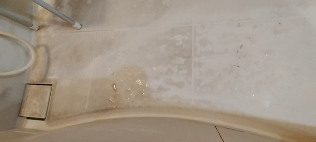 白い床の場合のグレーの汚れは多くの場合石鹸カスや皮脂汚れなのですが、今回それらを落とすアルカリ性の洗剤でやっても全く落ちない、、、、!!!