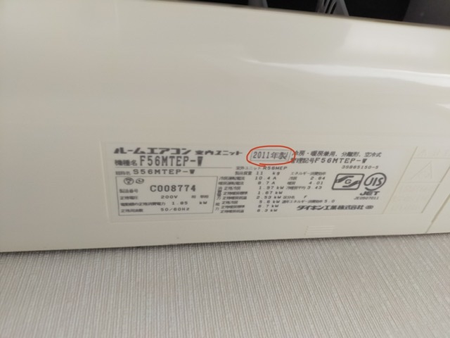エアコンの下面をみるとラベルがはってあり、そこに製造年が書いてあります。