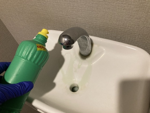 この時蛇口にサンポールをかけて放置すると洗剤やけを起こす可能性があるので、蛇口にはかからないように注意してください。