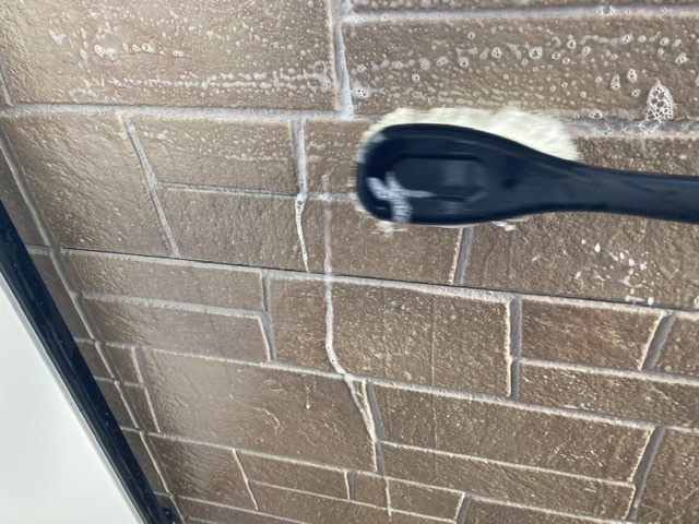 洗浄液をつけた洗車ブラシでベランダ全体を擦っていきます。