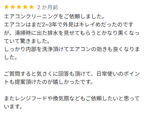 エアコンはまだ2~3年で外見はキレイめだったのですが、清掃時に出た排水を見せてもらうとかなり黒くなっていて驚きました。