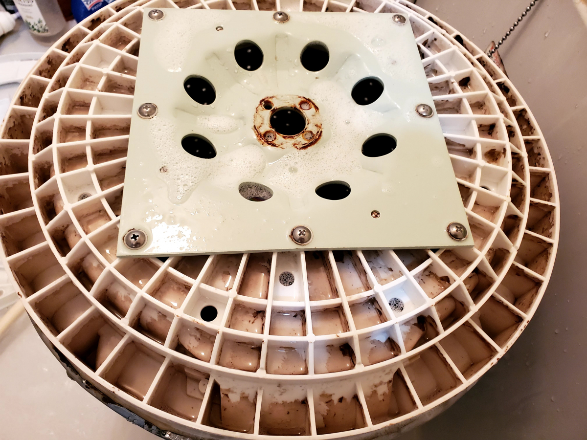 ステンレス部分に汚れがびっしり付いており、薬剤と高圧の水で