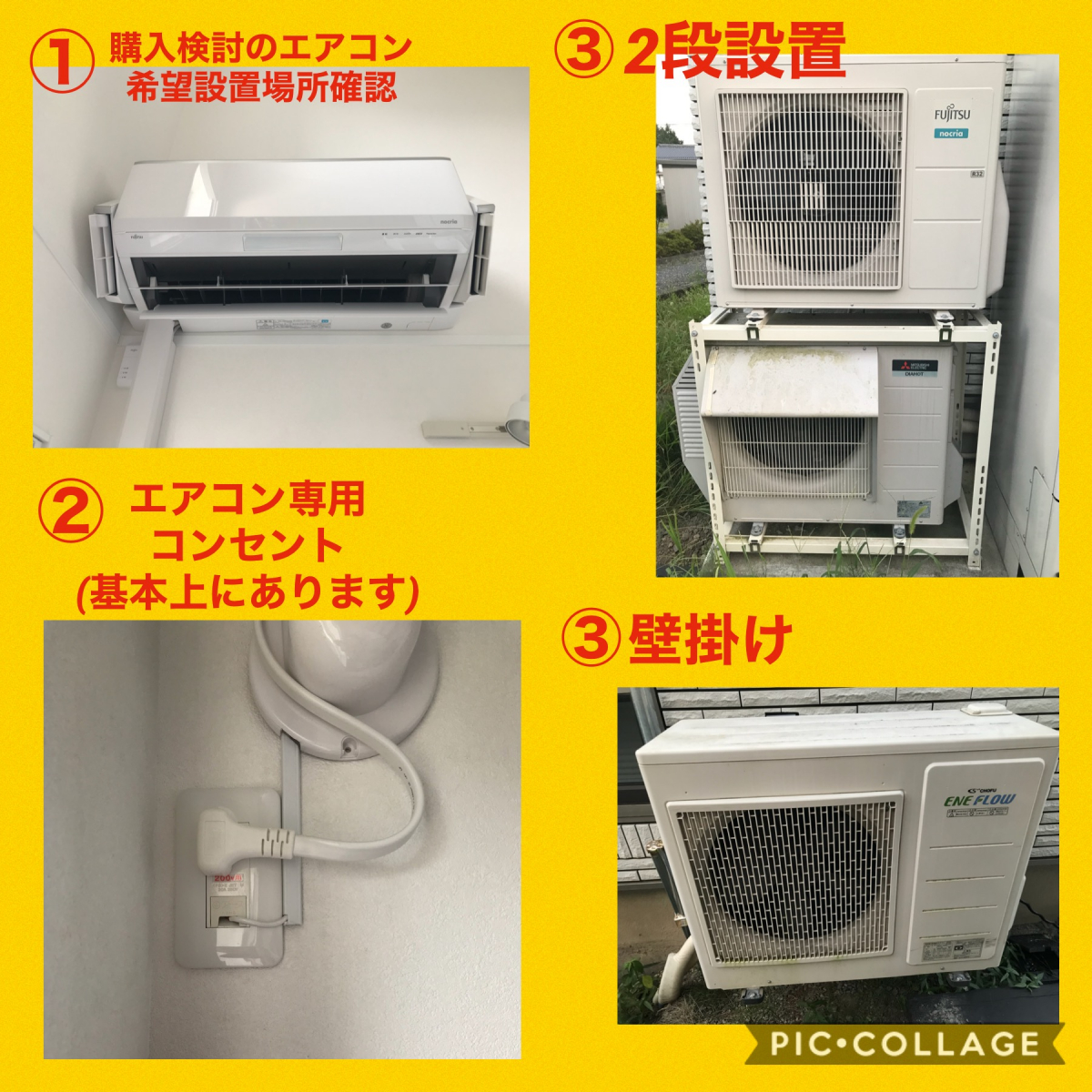 ③室外機設置場所も壁掛け、屋根置き、2段置き、など追加料金がかかる設置も!!基本は通常料金(工事費込が多いです)地面置きが一般的!!
