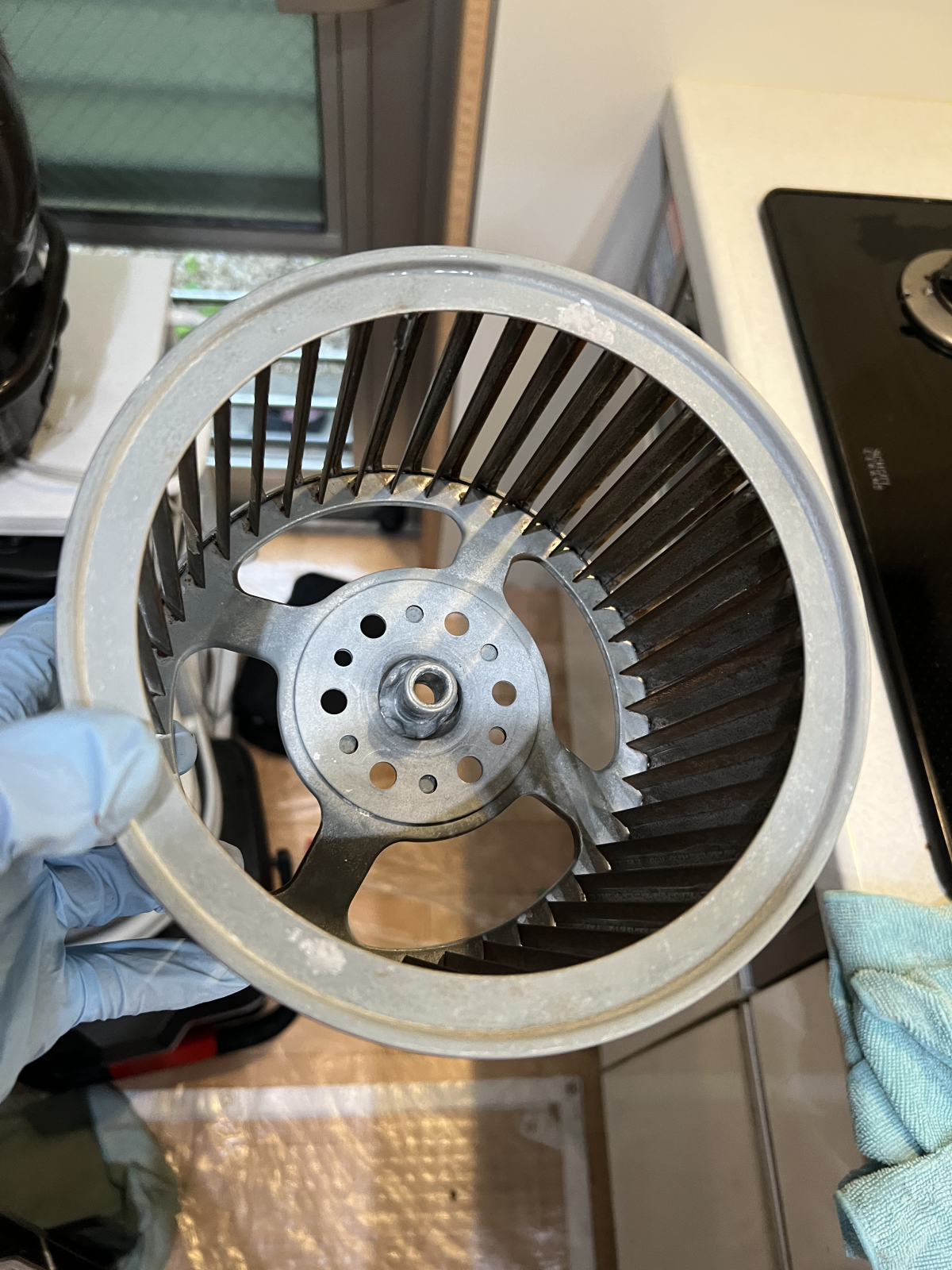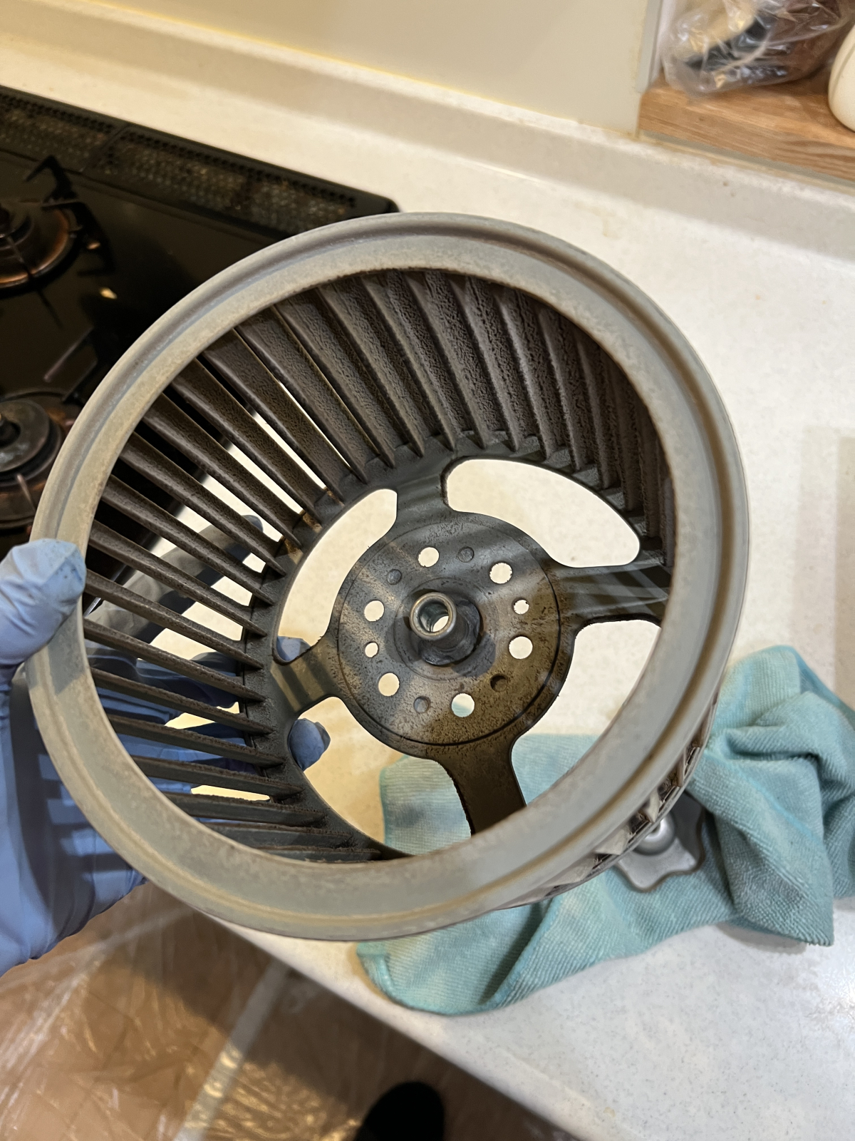 ファンの羽根には油とホコリが混ざり合った汚れがしっかり付いており、手洗いでは落としきれない状態でした。