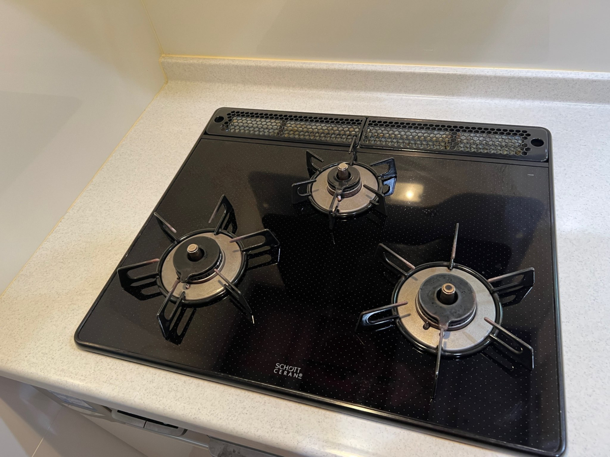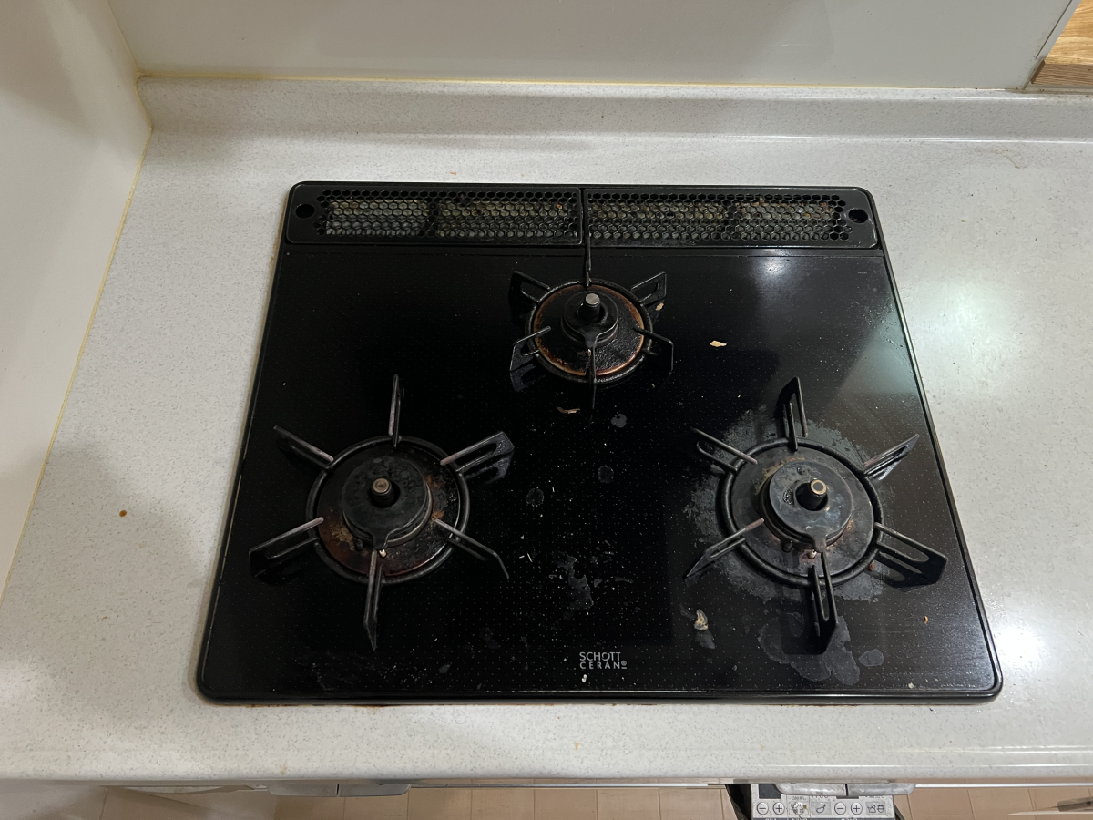 ガスコンロは、焦げ付きや油じみが目立っていました。