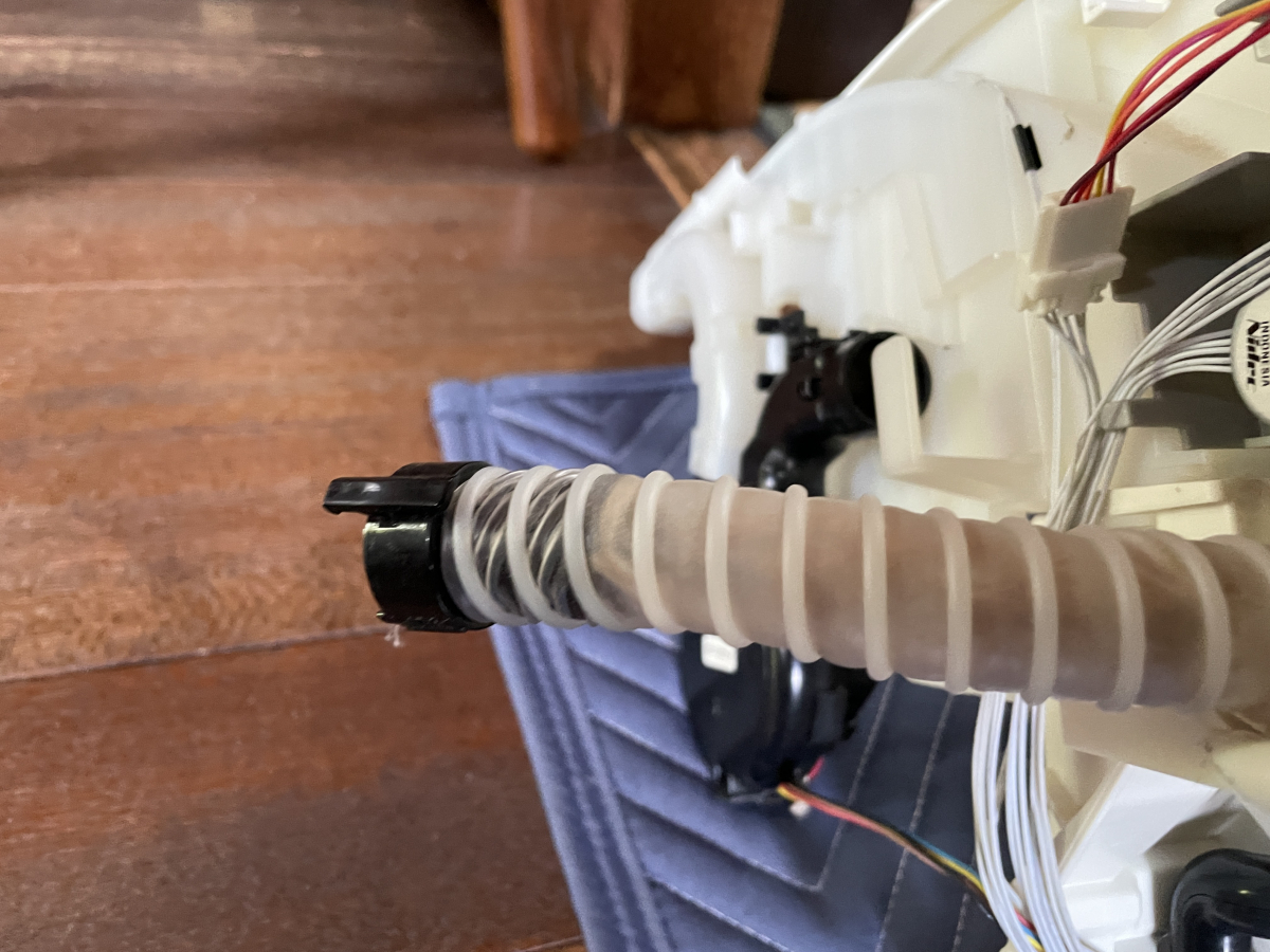 ホコリを吸って外に出す吸気ホースもホコリで詰まっていたので、分解して徹底的に洗浄いたしました!
