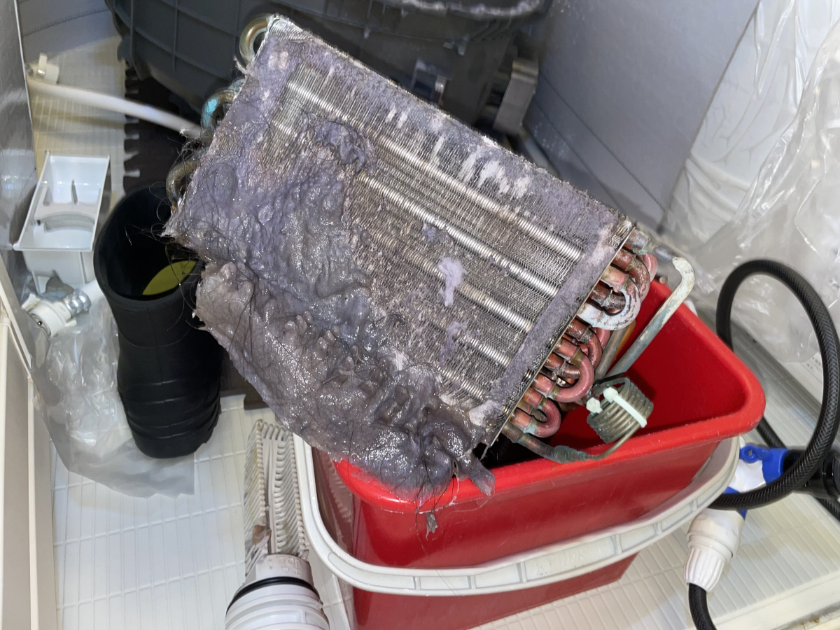 表面のフィルターを掃除しても改善しないのは、乾燥経路やヒートポンプの表面に汚れが蓄積しているためです。