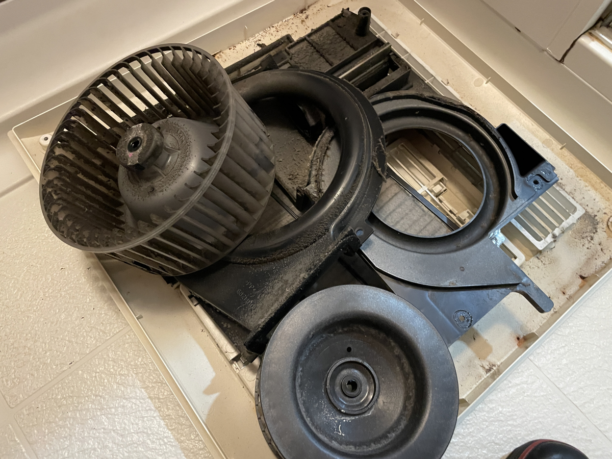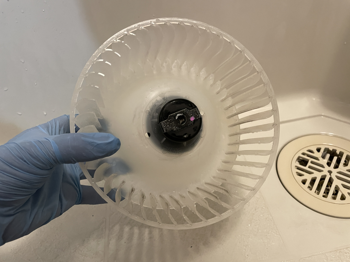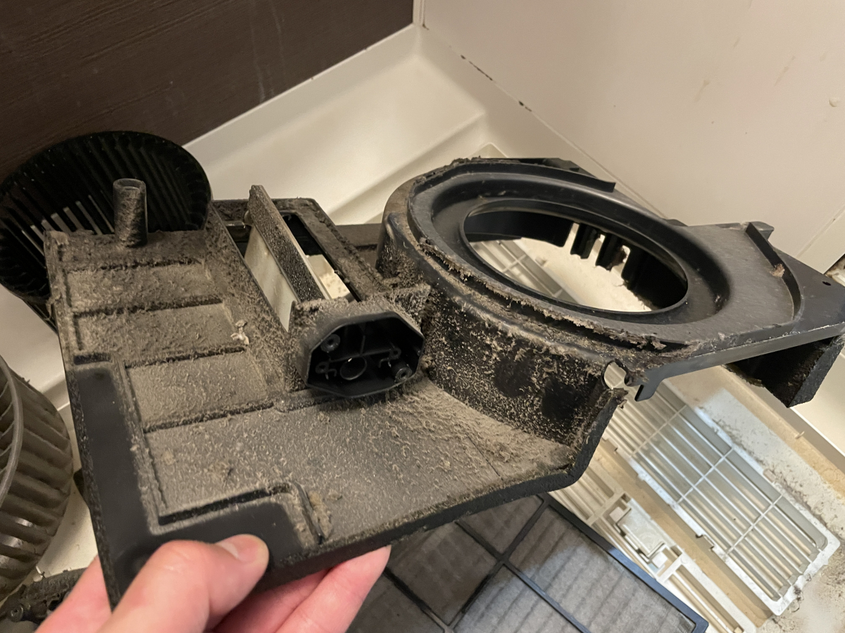 ファンもかなりカビとホコリで固着しておりましたが、専用の洗剤と高圧洗浄でなんとか汚れを取り除くすることができました!