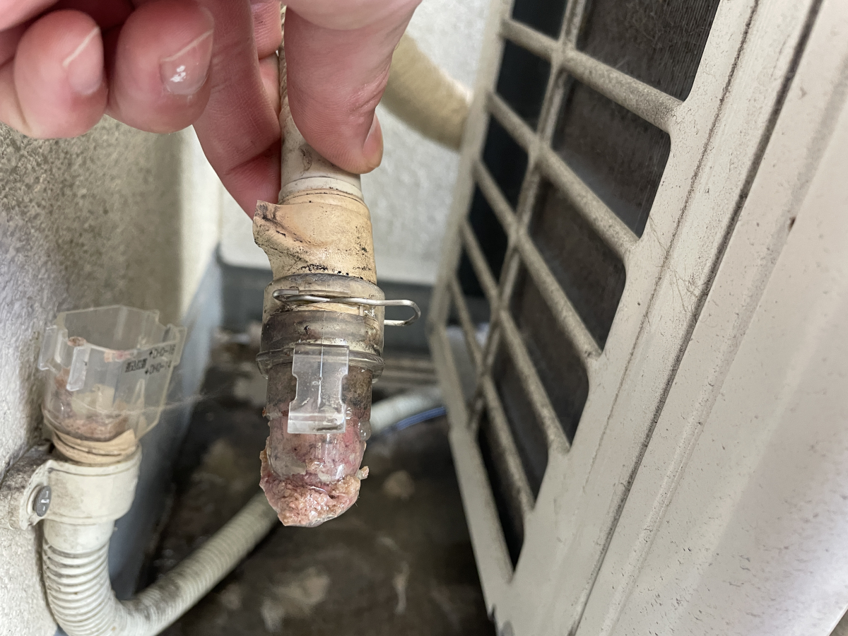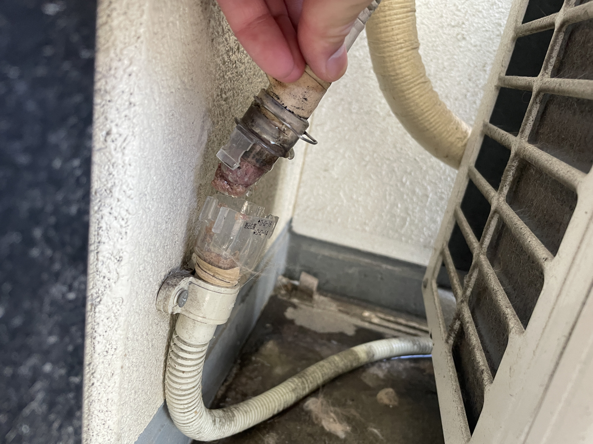 エアコンから水漏れがするとのことで、まずは外のドレンホースから確認!!