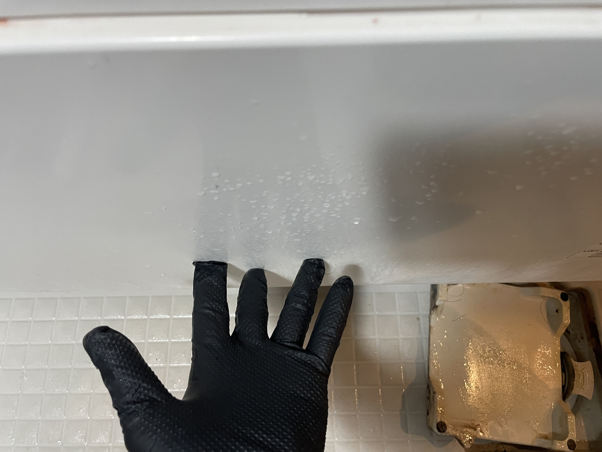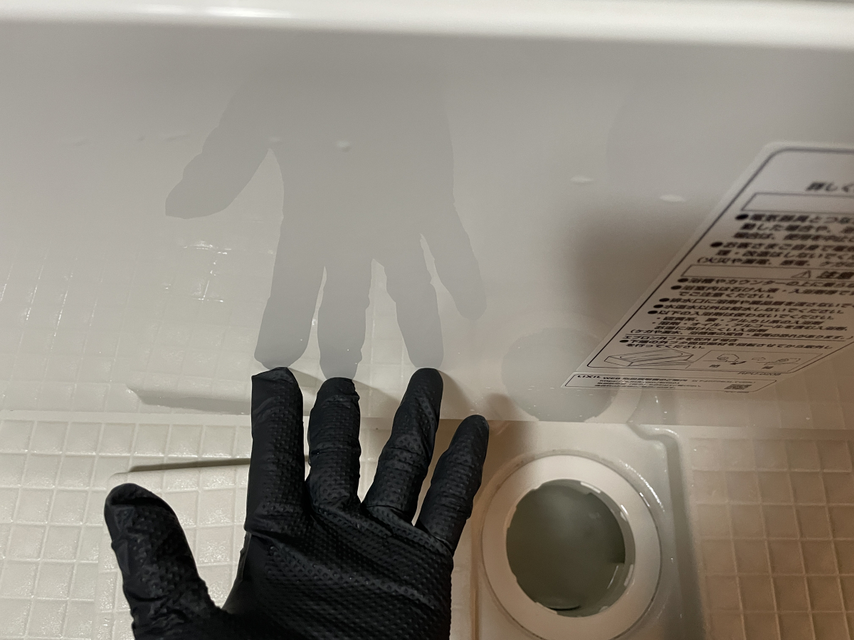 エプロンの表面は、パッと見はなにも汚れていないように見えますが、洗浄前後では手の反射具合がかなり違います!