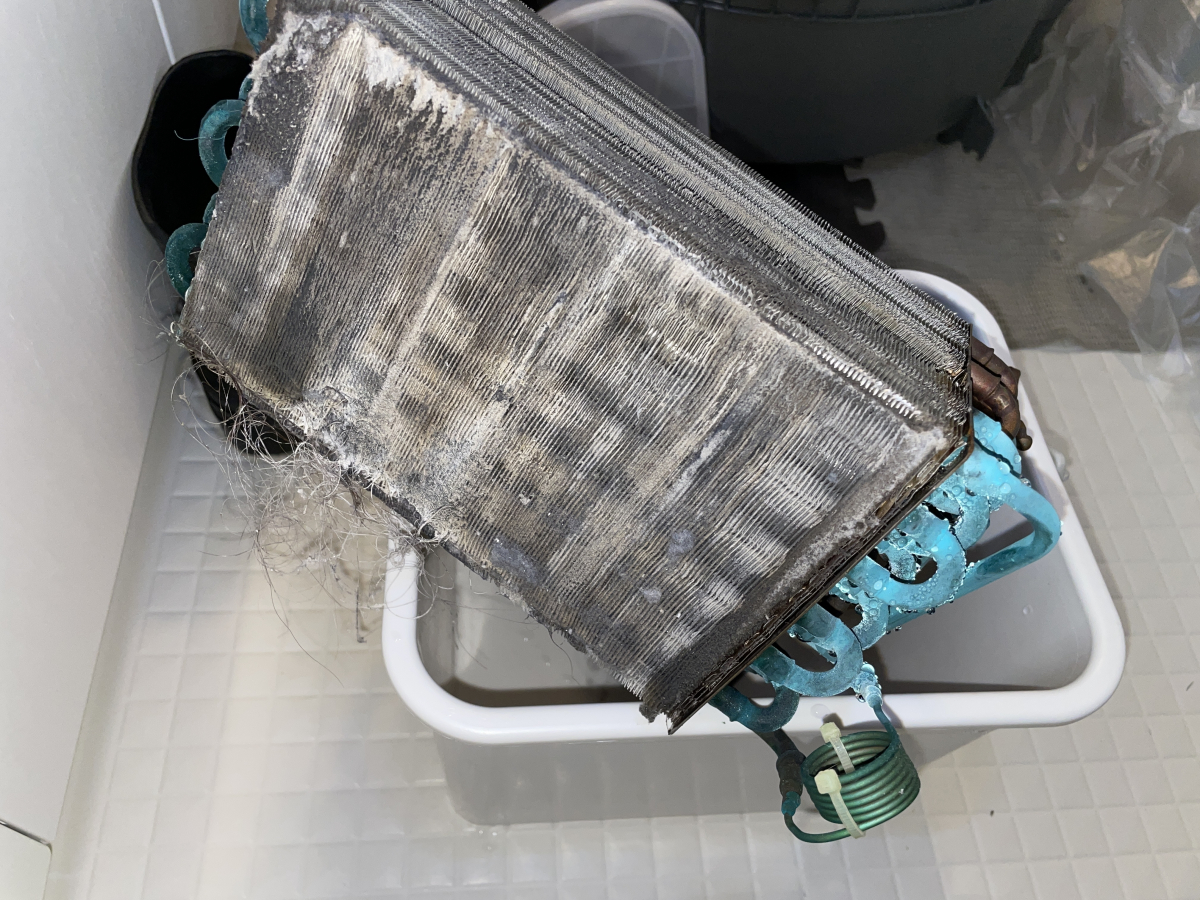 当店ではこのヒートポンプごと取り外して、専用の洗剤と高圧洗浄機で徹底的に洗浄いたします!