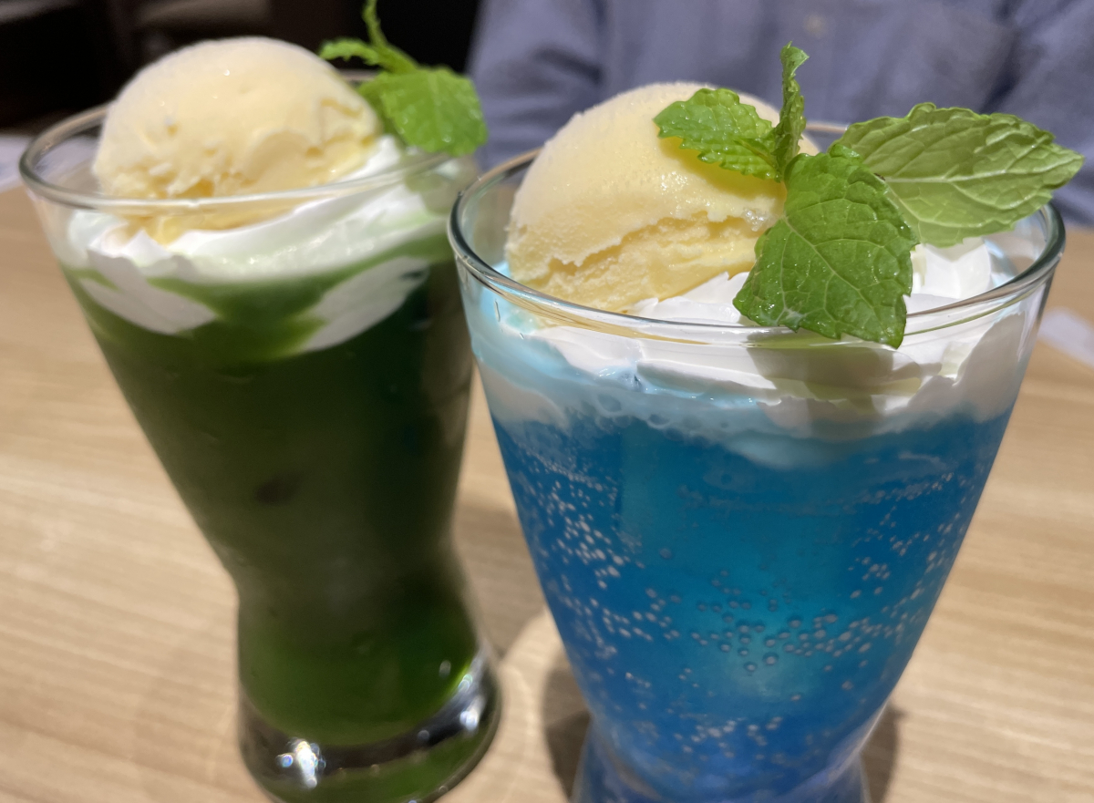 下の写真はその時飲んだブルーハワイフロートと、K君が飲んだ抹茶フロートです。