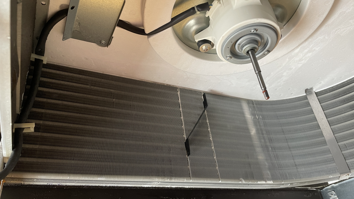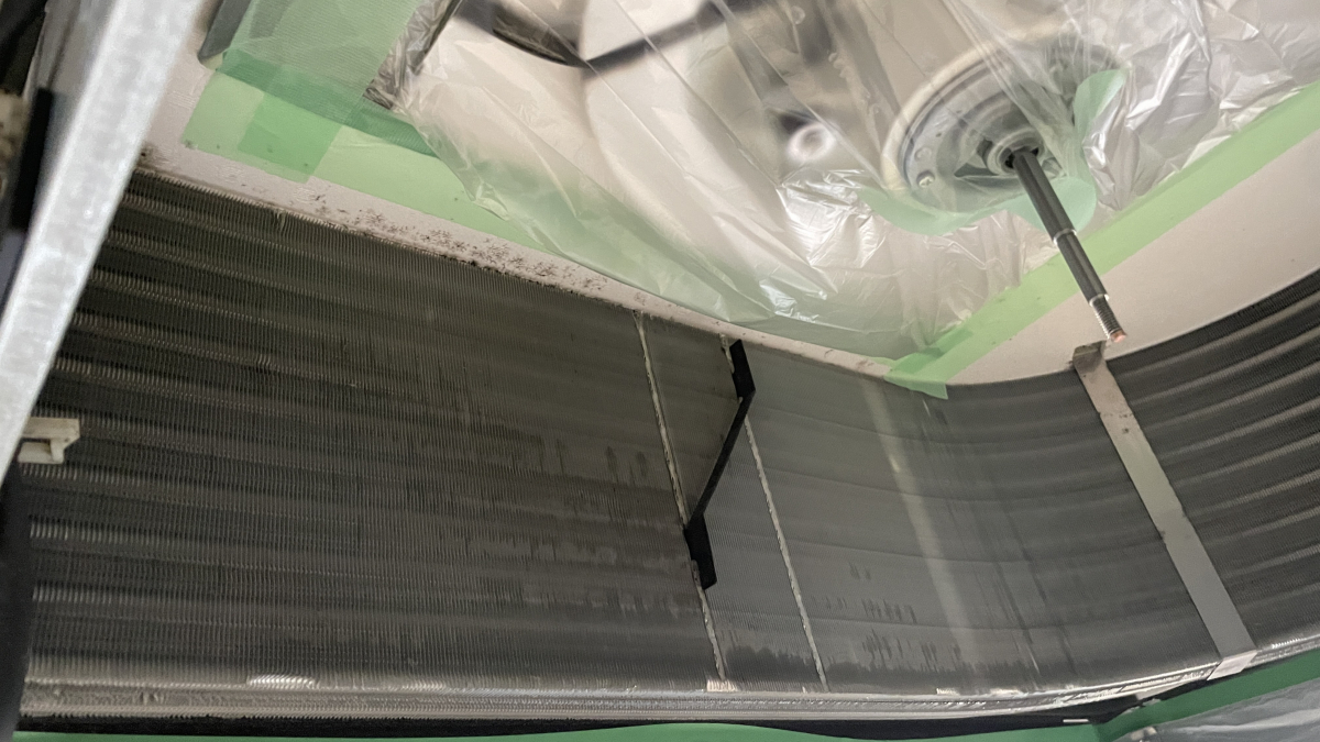 上の写真は熱交換器を撮影したもので、パーツを分解後にこれらも洗浄していきます(左が清掃前、みぎが清掃後です)。