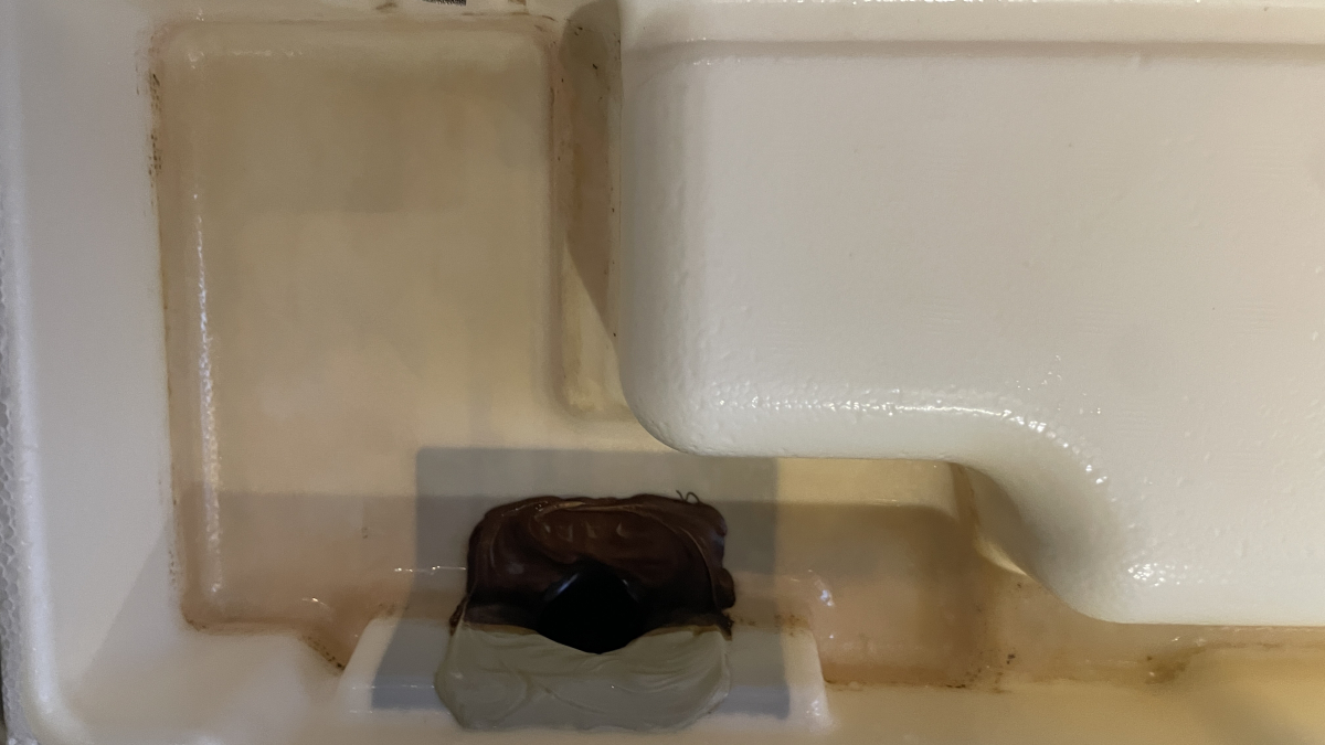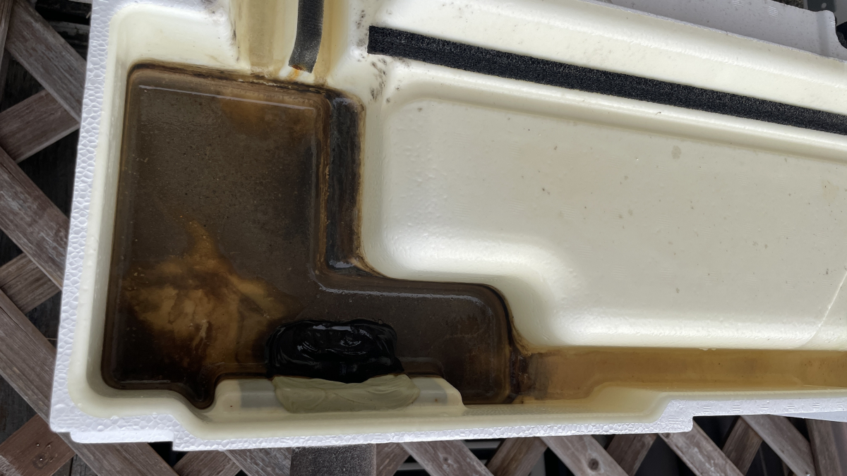 また結露水を溜めているドレンパンも取り外して洗浄していきます。ここはカビが生えやすい部分でして、臭いの元になりますのでしっかりと洗います٩( 'ω' )و