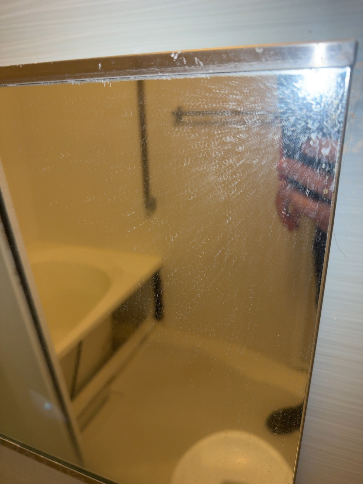 初めての浴室クリーニングで、鏡やカランの水垢と床の黒ずみでお困りでした。