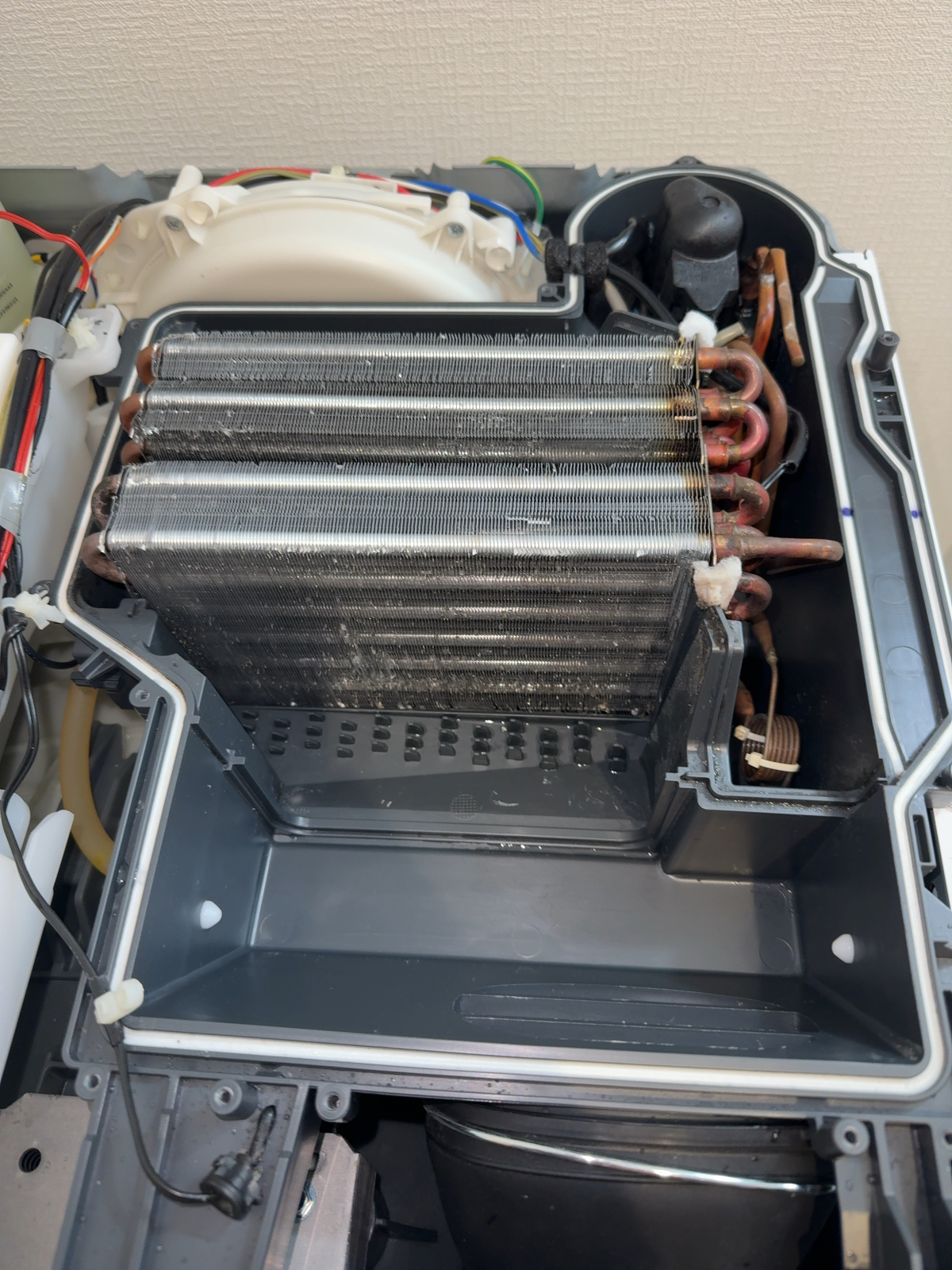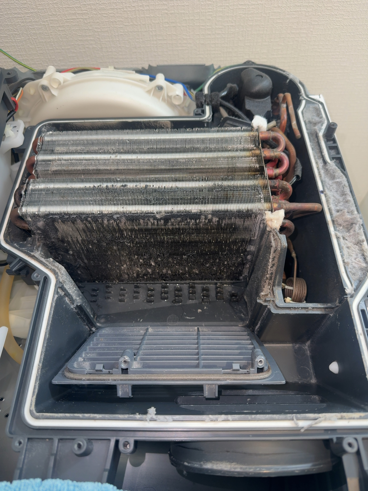 脱水カバー、乾燥経路、ヒートポンプをしっかり高圧洗浄し、カビ取りをし、ヒートポンプの根詰まりを解消し風通りがよくなり、乾燥時間の長さ、乾きの悪さが解消されました。