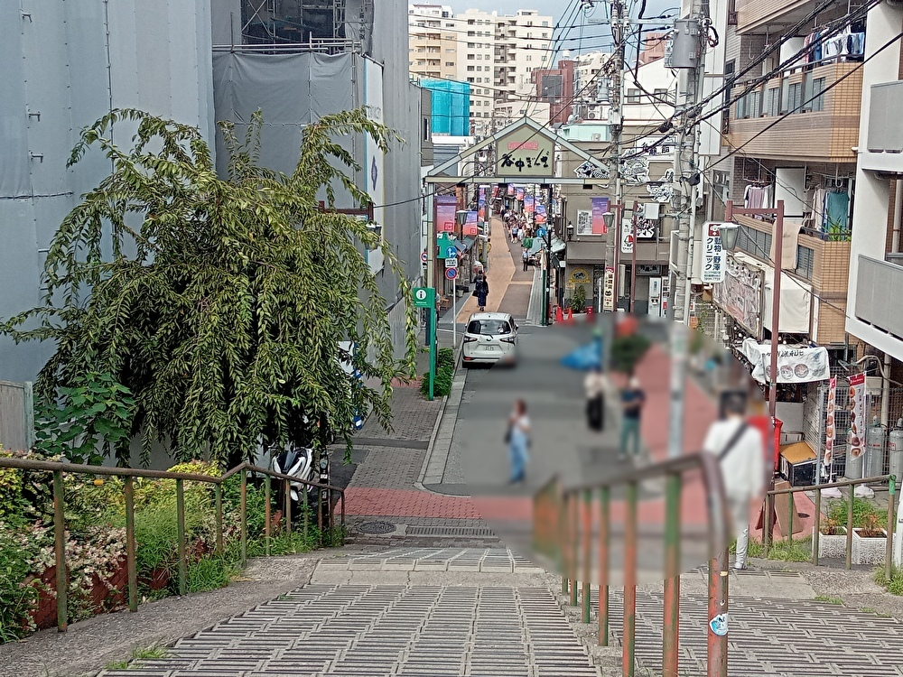 その出口から南に向かうと坂を見下ろして商店街が見えてきます。谷中ぎんざって看板が見えます。揚げ物を売っているお店や、インバウンド狙いのお店やらで、ちょっとカオスで面白いです。