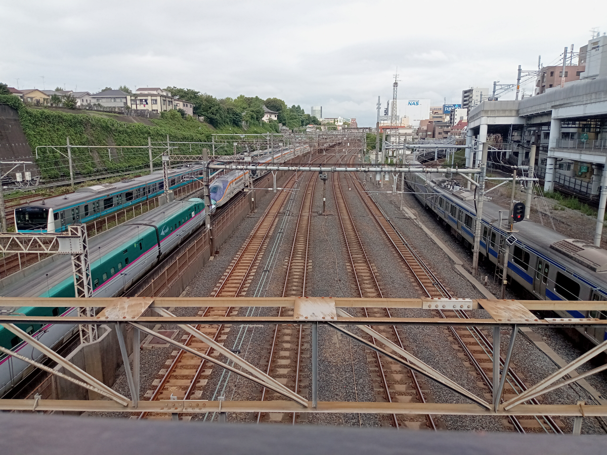 眺めといえば、日暮里駅の北側に出ると、線路をまたいだ高架上が出口になるんですが、ここって上野、東京に向かって走ってくる電車の線路が束なってるのが見える場所で、電車好きな人とか、子連れの親子とかがいつも欄干にかじりついてます。タイミングによっては、山手線、京浜東北線、高崎線、宇都宮線、常磐線、東北、上越新幹線、私鉄京成線…いっぱい集まるそうです。線路際のビルに入ってるファミレスなんかは窓際の席を希望する子連れの家族のウェイトで賑わってたりしています。