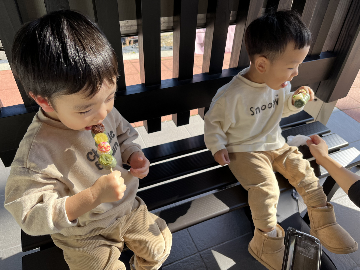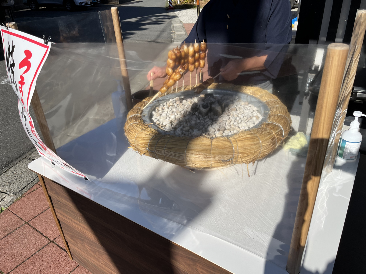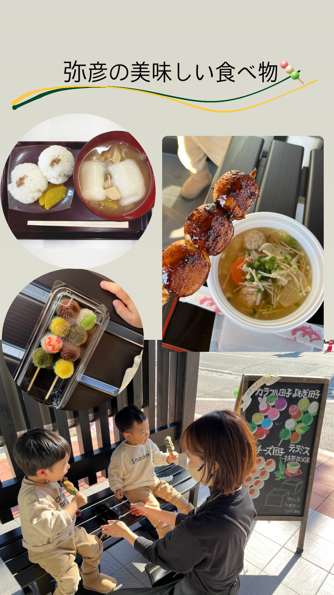 弥彦の美味しい食べ物♩我が家の定番コース!豚汁&塩おむすび→団子✨お正月期間はお雑煮ですよ〜!外で焼いてる焼きまんじゅう!西山製菓さんのお団子と弥彦スイーツさんのカラフル団子をローテーション⭐︎