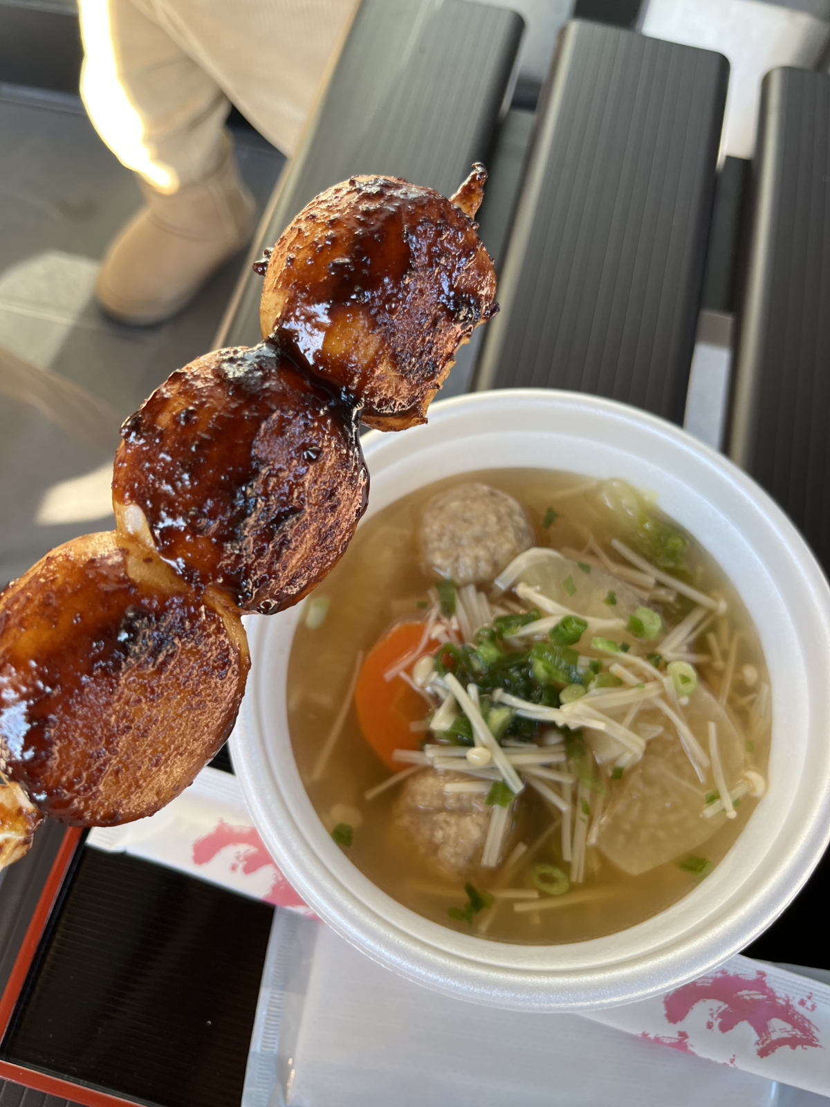 おもてなし広場の入りすぐ左側のお店に噂の豚汁と塩おむすび売ってます♪