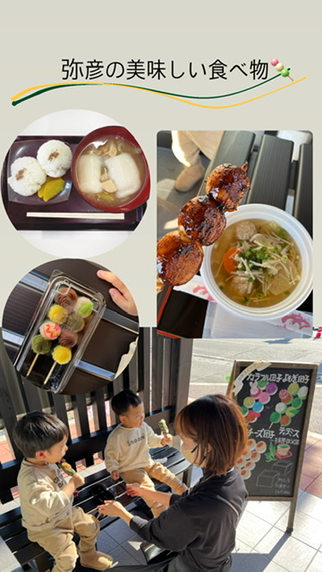 弥彦の美味しい食べ物♩我が家の定番コース!豚汁&塩おむすび→団子✨お正月期間はお雑煮ですよ〜!外で焼いてる焼きまんじゅう!西山製菓さんのお団子と弥彦スイーツさんのカラフル団子をローテーション⭐︎