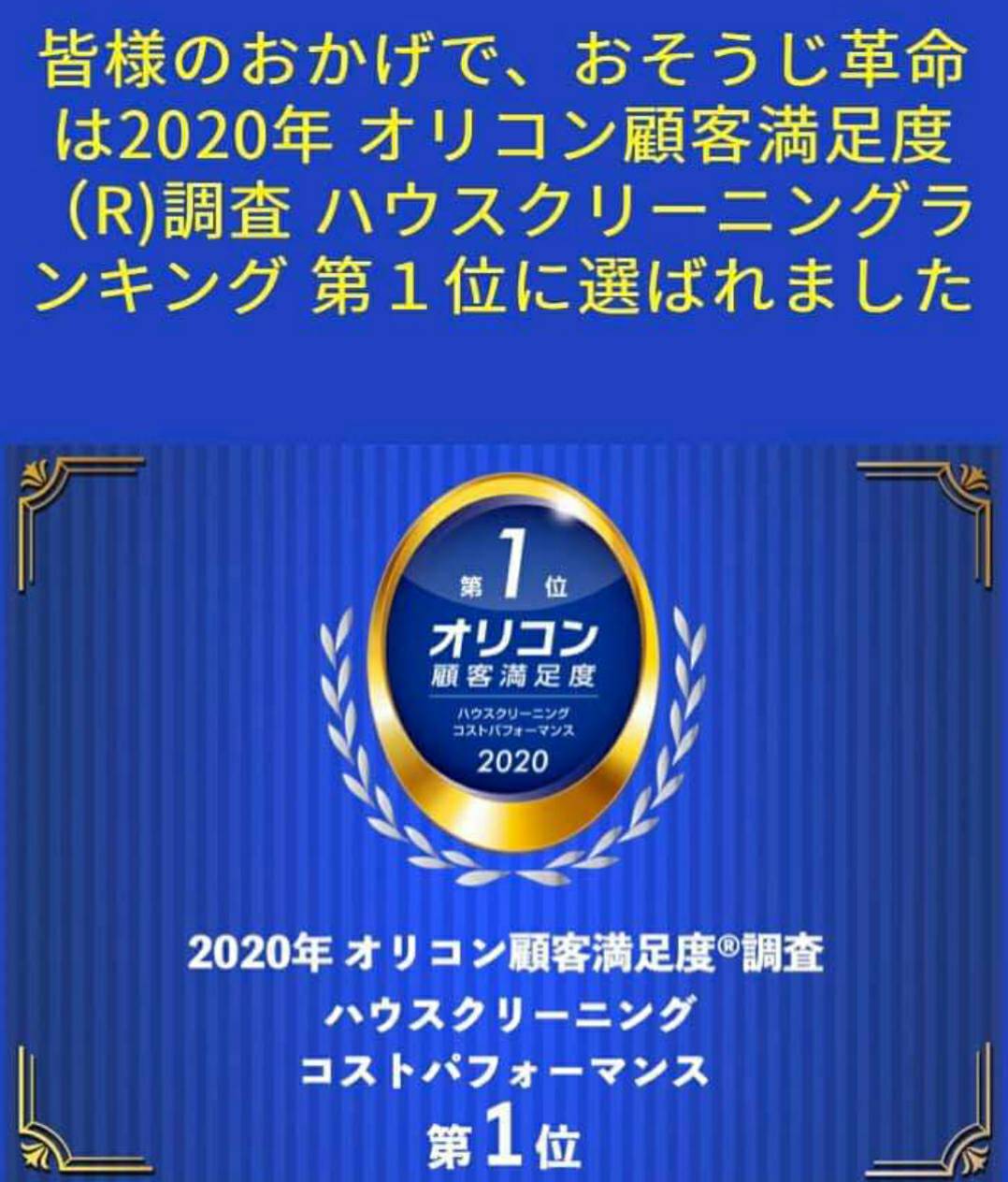 2020オリコン顧客満足度ランキングのハウスクリーニング部門で過去最高得点で1位を獲得しました!
