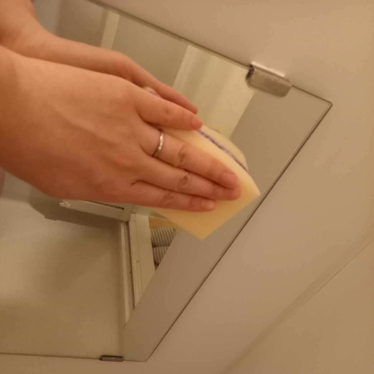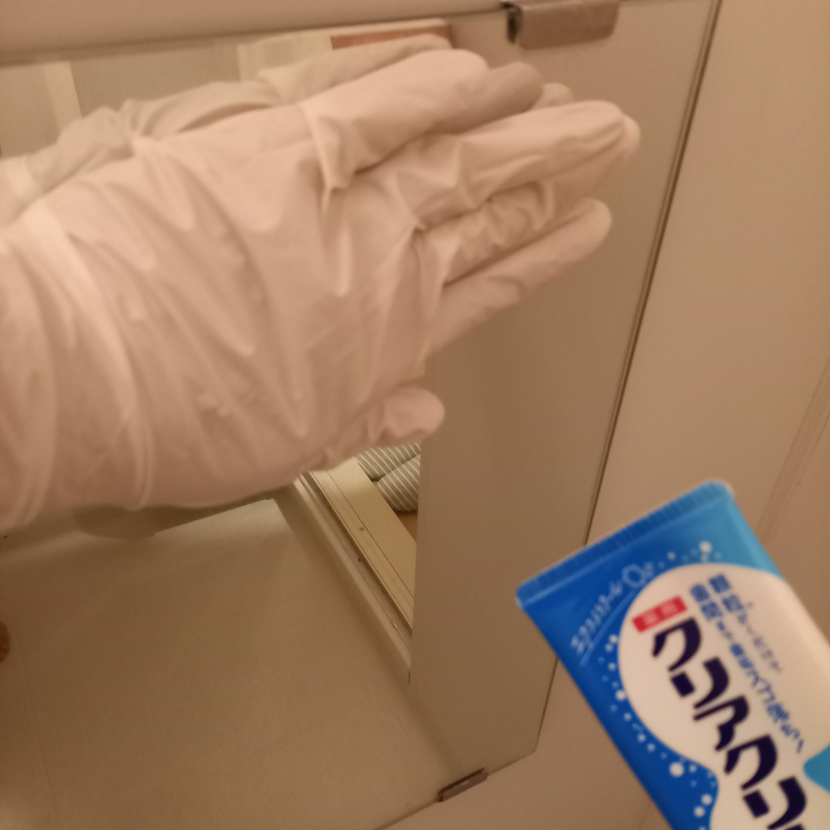 方法はゴム手袋はめた手に研磨剤を付け、スポンジの時と同様に鏡を磨きましょう!