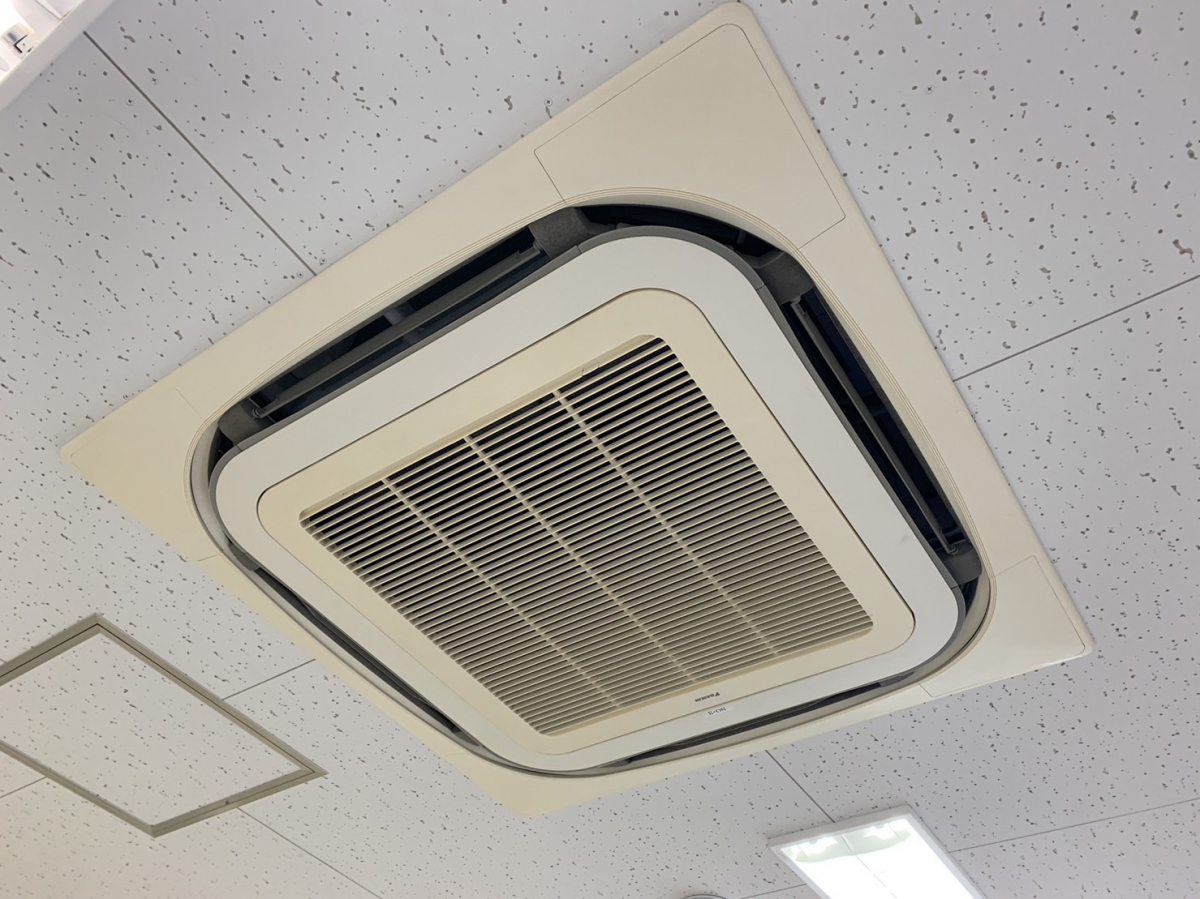 エアコンは事業所、店舗で良く見かける天井埋め込み4方向、天井カセット型いわゆる天カセエアコンとなります。
