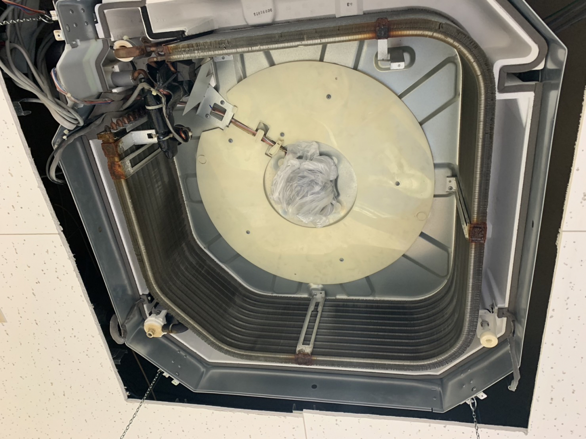 東久留米市の会社様事務所にて天井埋め込み4方向エアコン分解内部洗浄クリーニング