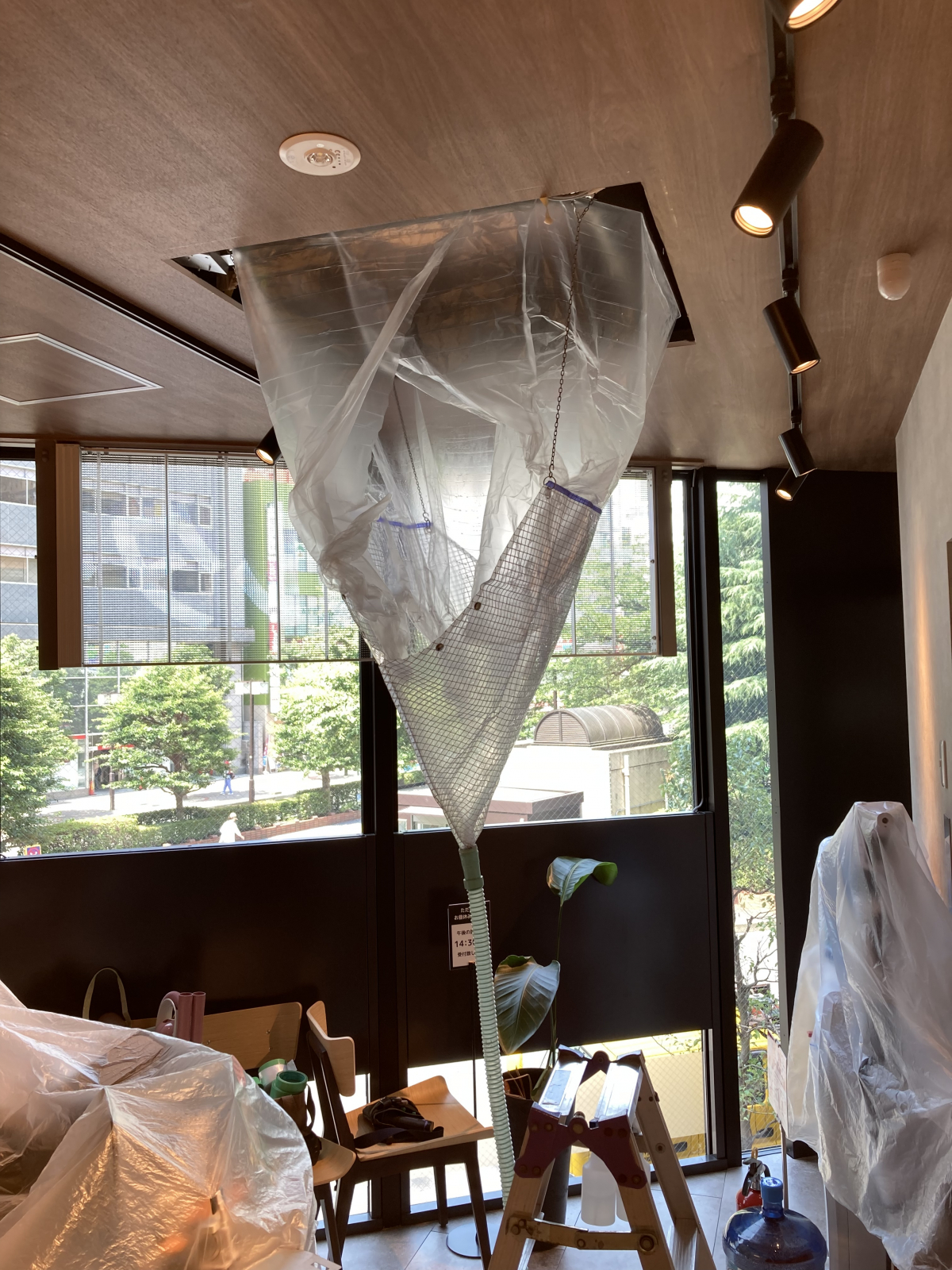 業務用エアコンクリーニングの時は、エアコンのブレーカーを落とさなくてはなりません。今回は一つのブレーカーで全てのエアコンがストップしてしまう形だったため、暑かったです……。笑