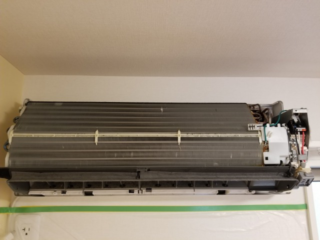 エアコンのコンセントを抜き、フィルター、カバー、パネル、ルーバー、など外せる限りを外して、熱交換器を掃除しやすいようにします。