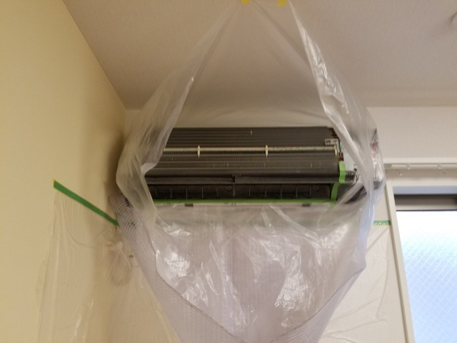 養生とは、エアコン内部の濡れてはいけない部分(基盤やモーター部分など)やエアコンの周りの壁、置いてあるお客様の私物(動かせなかったもの)などを、マスカーというビニール素材のものでおおっていきます。