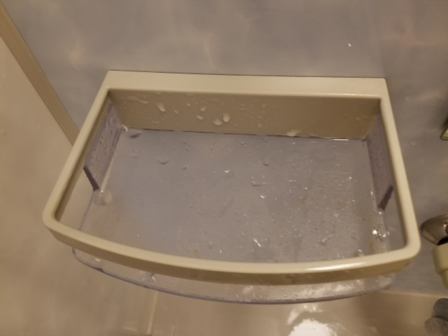 最初にカビプロでつけおきしていた、排水口・シャンプー棚を清掃する。