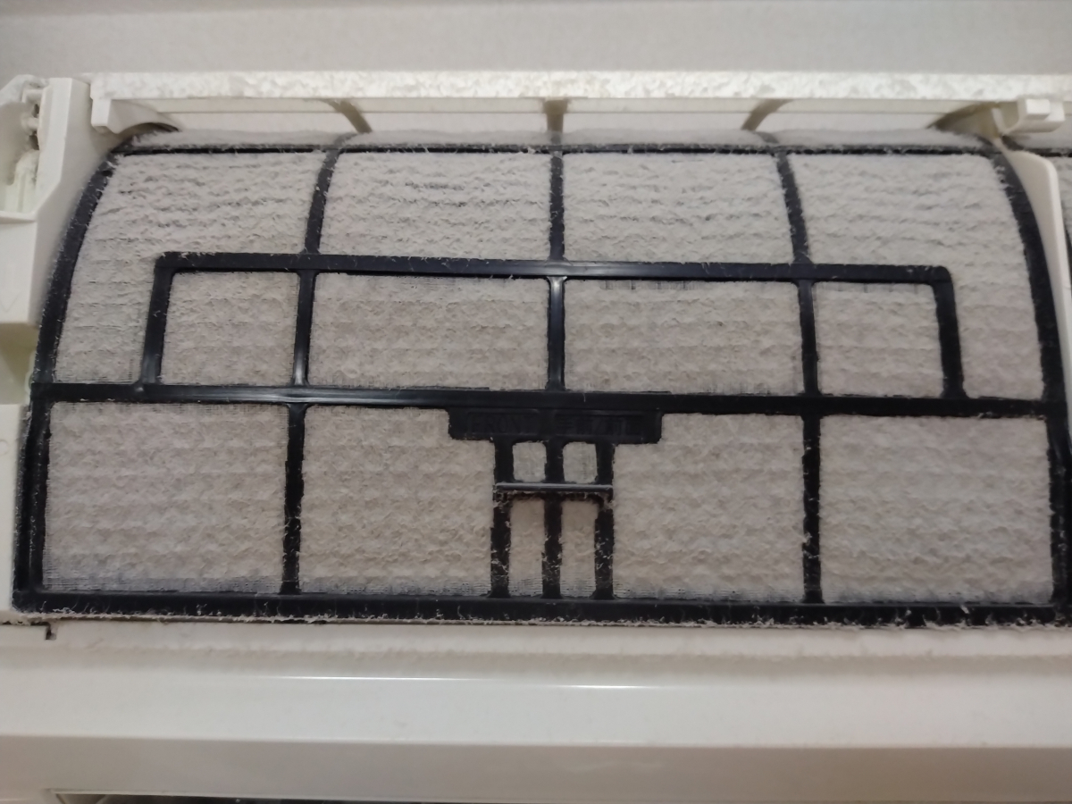 エアコンのフロントパネルを開けると、フィルターがあります(一般エアコン)。上記の写真の様に、ホコリが付着していませんか?