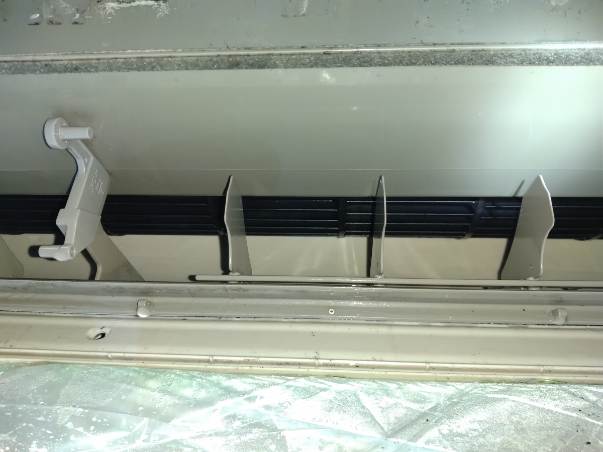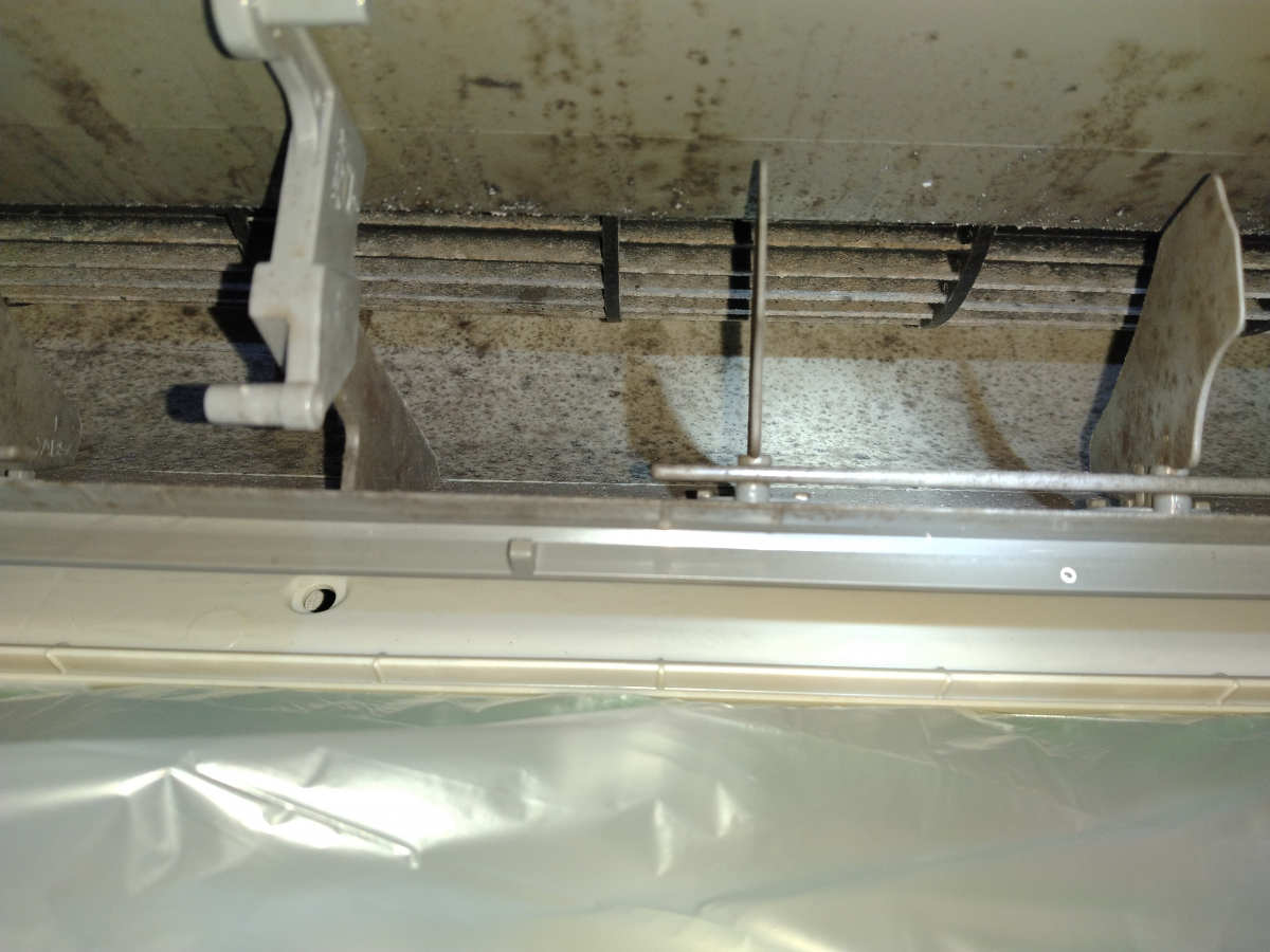 最後に風の出て来る吹き出し口です。こちらは停止時にゆっくりと風向器(ルーバー)を開けると目視できるかと思います。確認して頂きたいのが、奥に見える回転するファンの部分です。このファンの部分に熱交換器同様、ホコリやカビがこびり付いていると、風量が弱くなり、結果として冷えにくい状態になってしまいます。