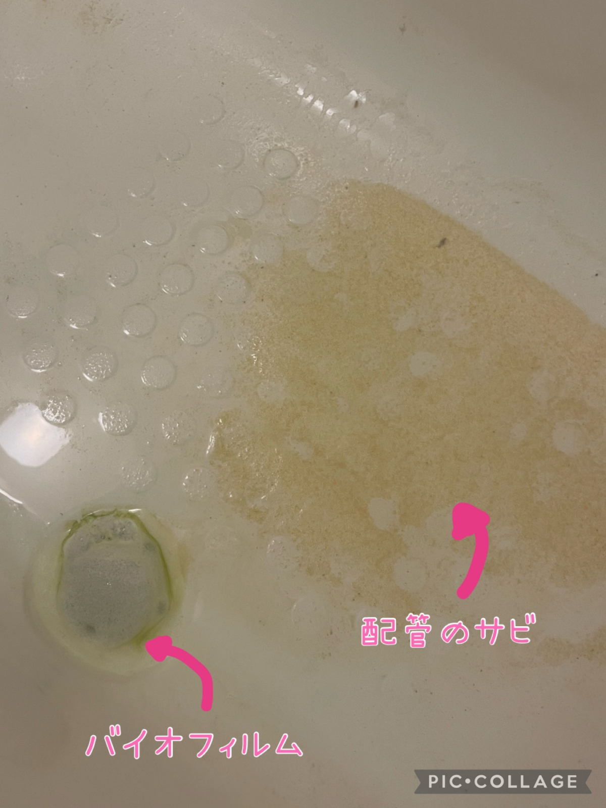 上記の画像は以前に洗浄させていただいた際に出てきた汚れです。緑色のバイオフィルム(細菌や雑菌の集合体でヌルヌルの膜状の物体)と茶色いサビが取れています。