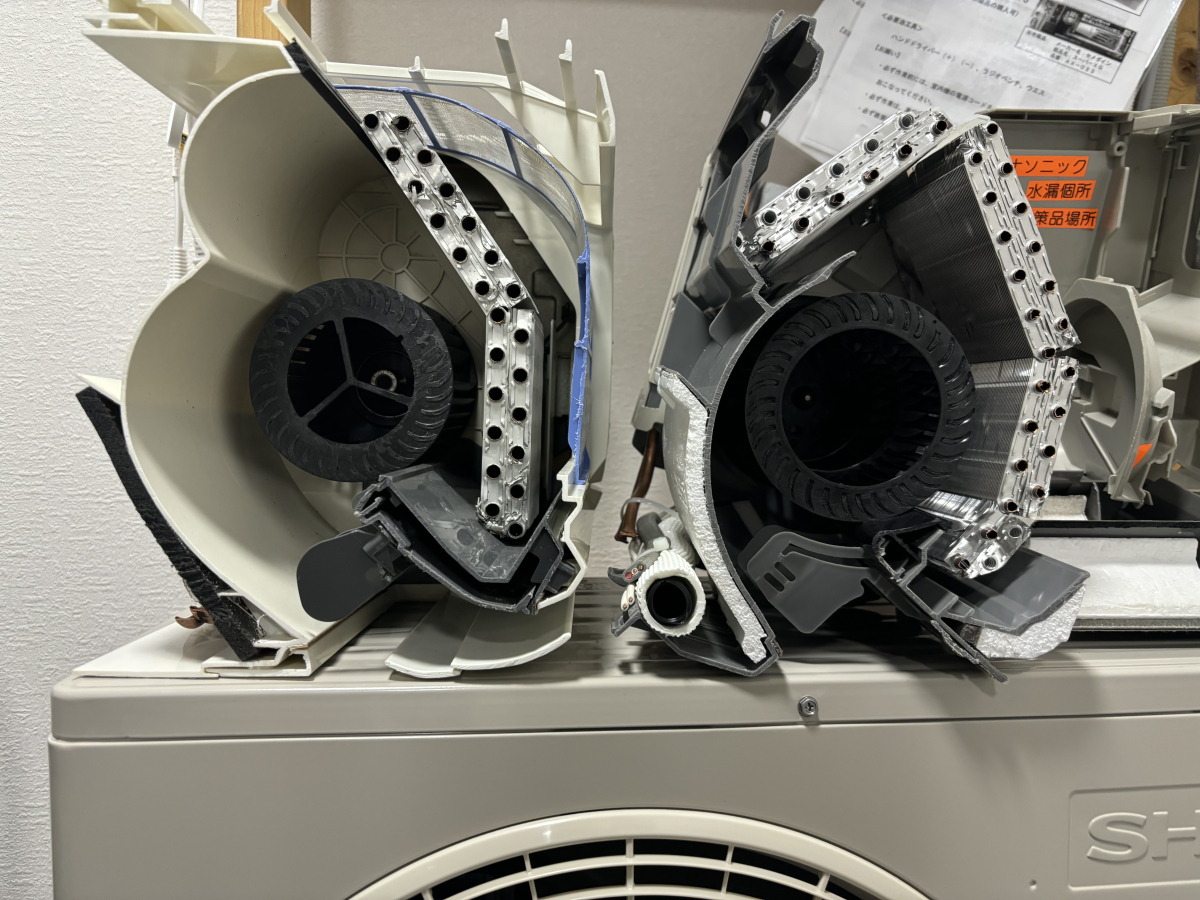 ↑こちらの画像はエアコンを真ん中で縦にぶった切ったところを横から撮ったものです。