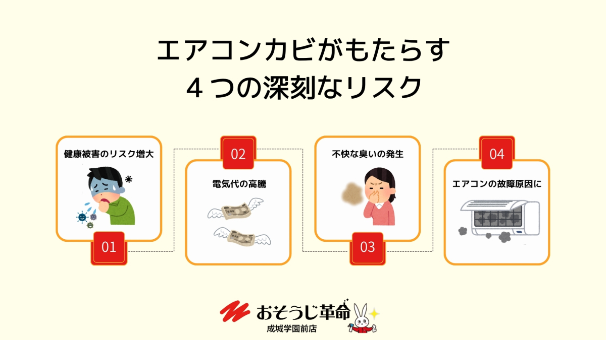 エアコン内部のカビを放置すると、単に「汚い」というだけでなく、以下のような深刻な問題を引き起こします。