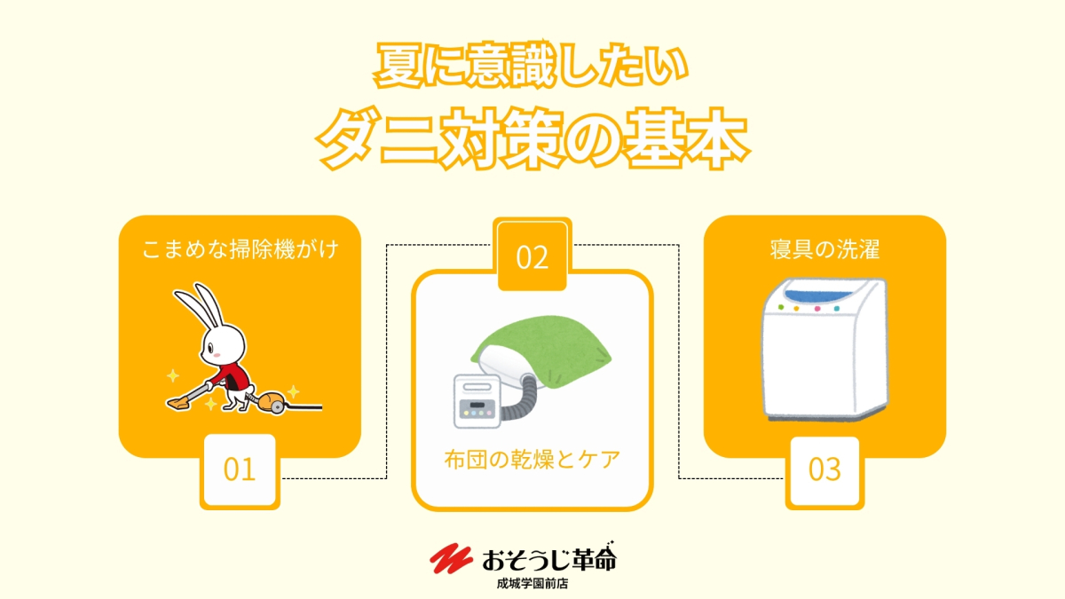 後編では、もう一つの夏の強敵、ダニへの対策と、日常でできるカビ・ダニ両方の予防策をご紹介します。