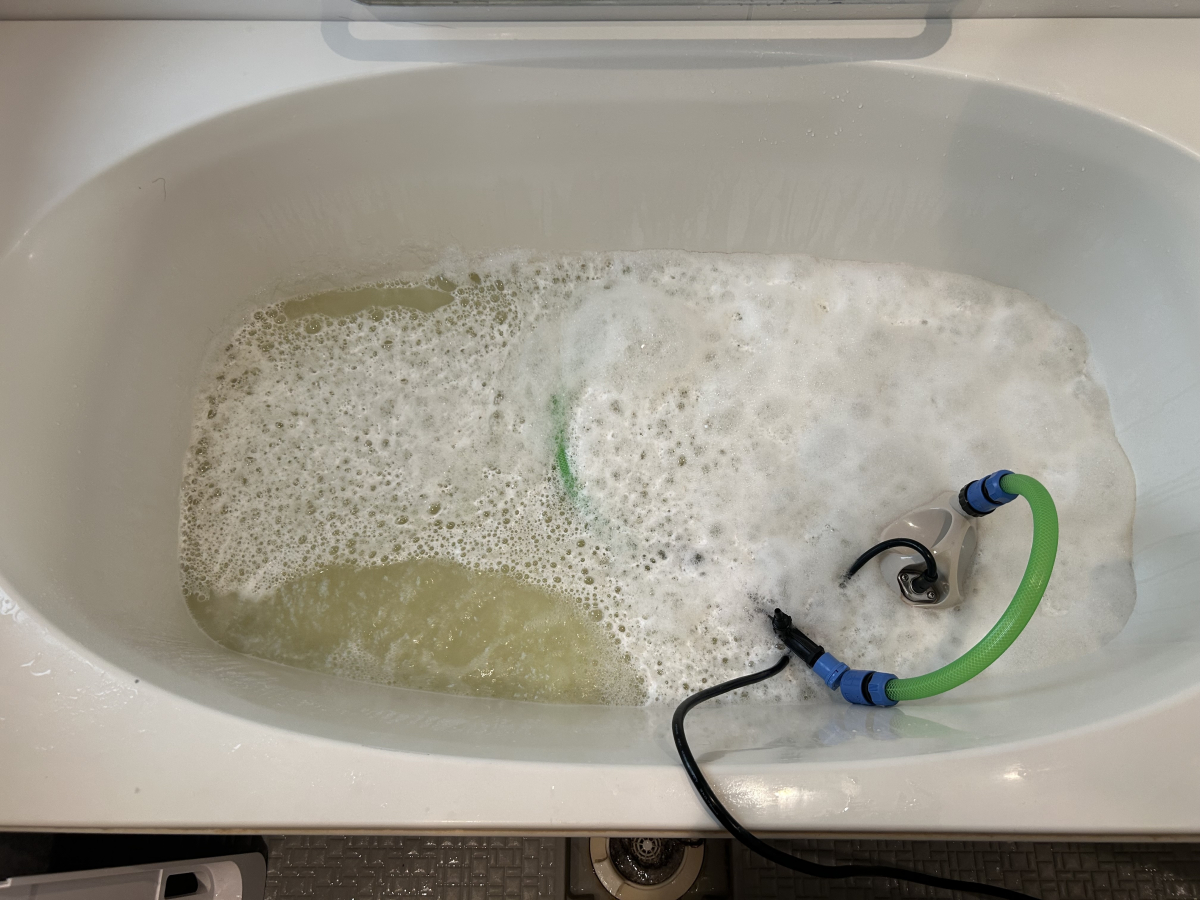 写真をご覧いただくとわかるように、透明だったお湯が一気に濁って、泡と一緒に茶色く汚れが浮き出てきています。