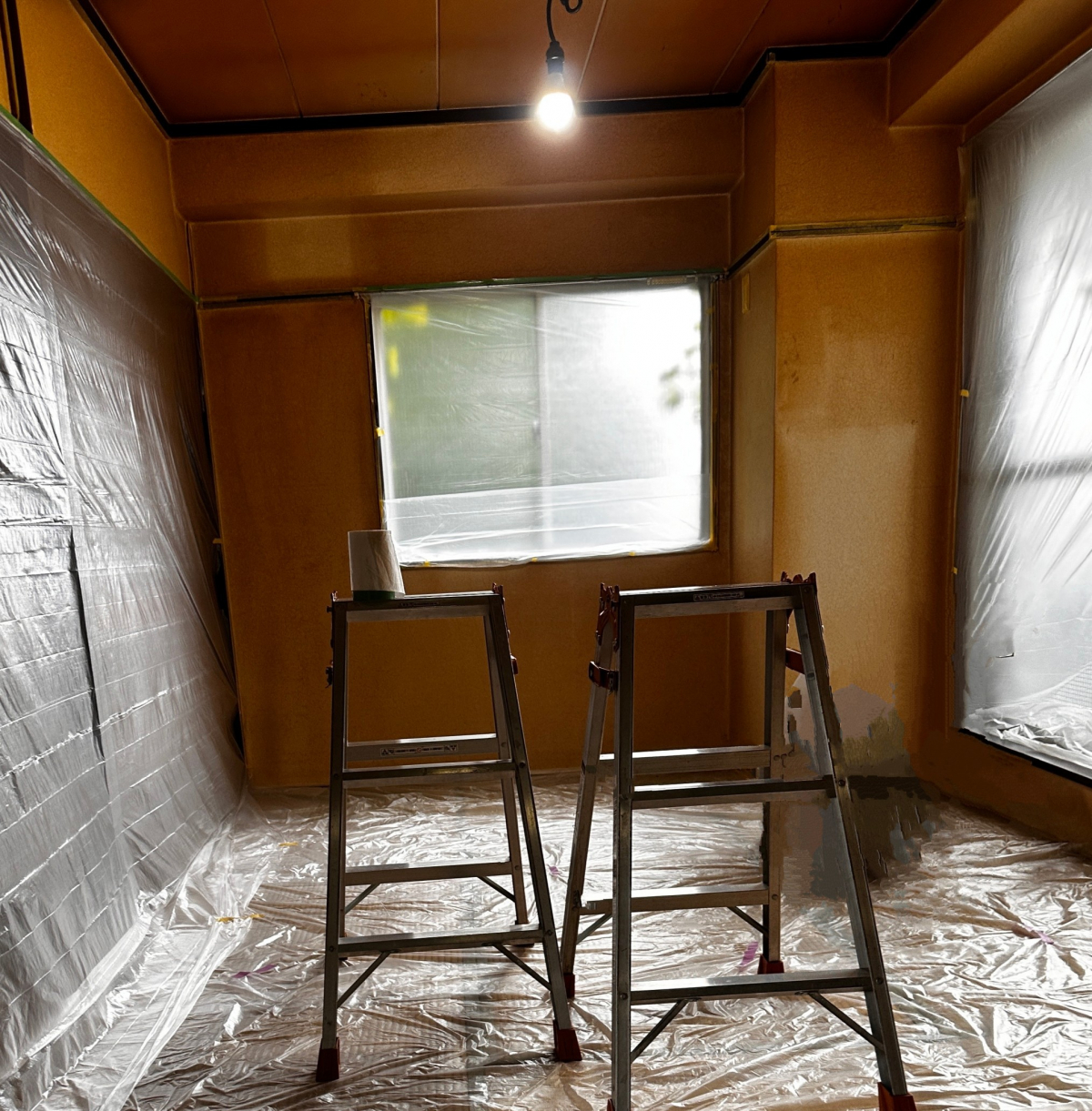 建具は塗らないのでマスキングテープを建具に全て貼り付け養生を行いました。
